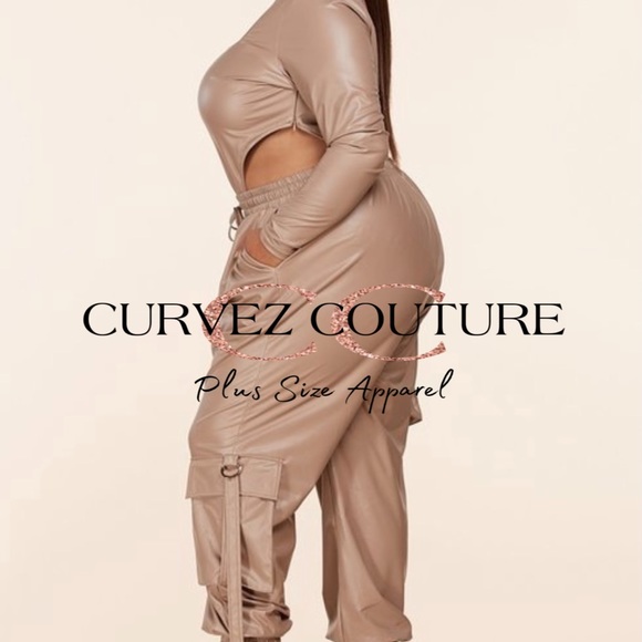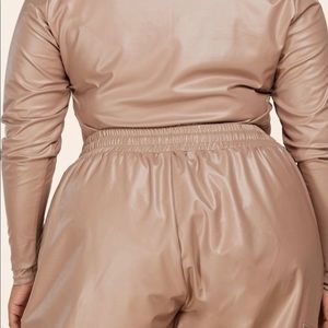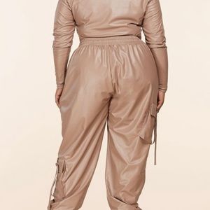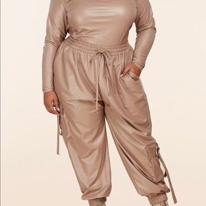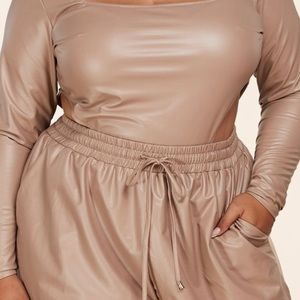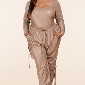 Two Piece set in stretchy faux leather. Scoop neckline and high leg cut keeps the bodysuit extra sexy, giving a peek of skin between the bodysuit and joggers. The joggers are complete with a drawstring waistband, slash pockets, patch pockets, and gold detail.