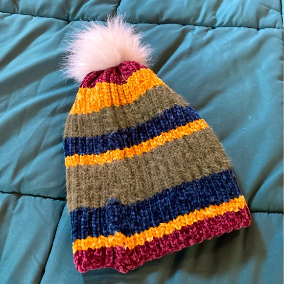 Navy Blue, Green, Yellow and Burgundy stripes beanie with white poof.