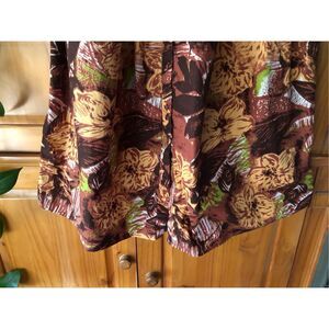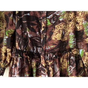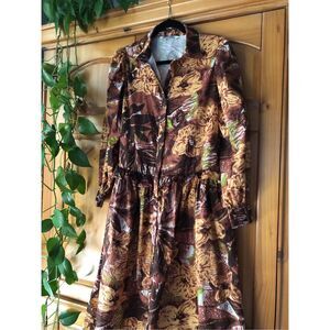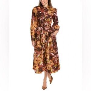 Beautiful Walter Baker 100% cotton floral shirt dress in warm autumn tones of brown, gold, and hints of green. Features a button-front closure, collared neckline, and long sleeves with gathered cuffs. The elastic waist gives a flattering fit, while the soft cotton fabric keeps it breathable and comfortable.
