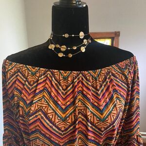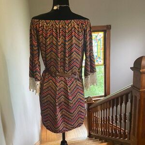 This off-the-shoulder patterned Boho dress has stunning lace sleeve detailing and looks chic with or without a belt (belt not included).