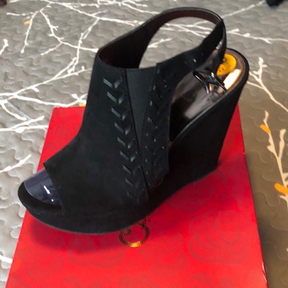 This bootie is amazing Its black suede , stitching on one side makes your foot look so small. Great wedge size . Can be worn with a cute dress!