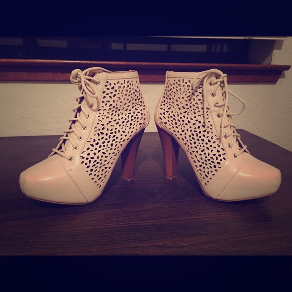 Shoe Color: cream. Heel color: wood 4.5 inch heel, 1 inch platform. Sides have a pattern cutout 🚫no trades