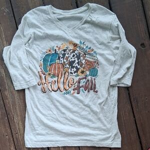 Box includes one size medium 3/4 sleeve length shirt, one Fall mug, and one decorative Fall reversible sign.
