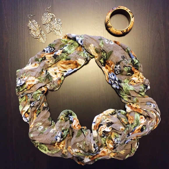 Floral scarf, gold leaf earings from forever 21, and a wooden bangle. All in great condition, rarely used.