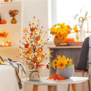 FALL DECOR: This artificial autumn tree is made from a cement base, pumpkin, maple leaves, and berries, full of autumn elements. The exquisite and compact desktop maple tree will fill a unique and joyful atmosphere for this autumn.