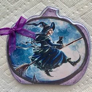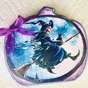 Wooden Pumpkin Wall Plaque with Witch riding a broom decoupage.