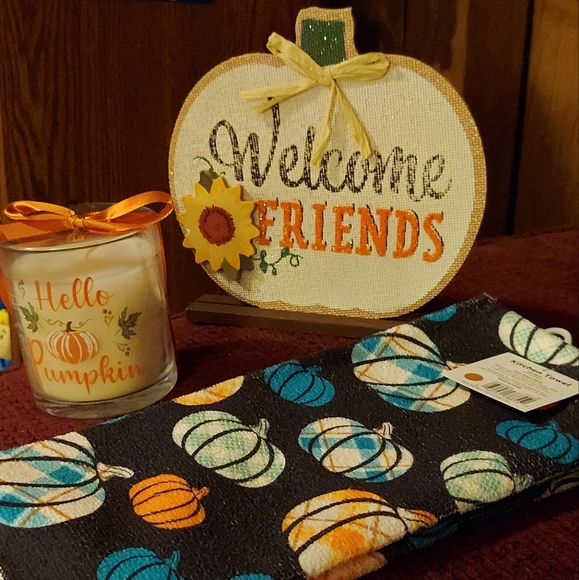 fall decor bundle. kitchen towel, candle, and table decor. new and very nice for fall. you will love it!!!