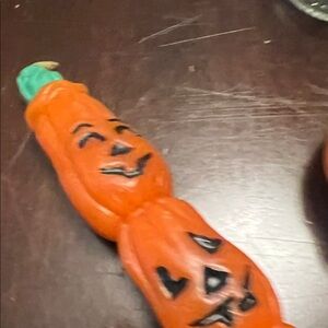 Set of Halloween-themed pumpkin decor. Includes orange pumpkin candle holders and salt and pepper shakers, five napkin rings from Pier 1. To vintage pumpkin stack candles they are a little warped at the bottom and not in perfect condition, please see pictures.