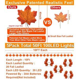🧿[Size] 5 Pack Design Patent Maples Leaves with String Lights:5 fall garland string lights ,each 10 ft 20 LED, Total in 50 ft 100 LED. The length between LED lights is 5.5 inch, enough to meet your diverse needs