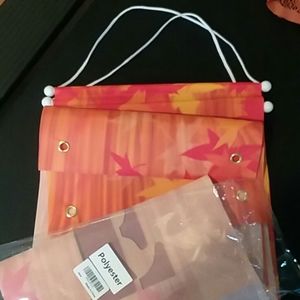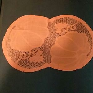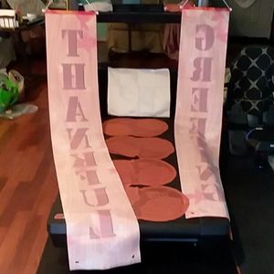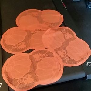 4ea lace pumpkin placemats. 12in X 18in, 2ea almost 6foot X 12in banners with rope plastic hangers and former holes in bottom. One burlap style pillow cover 17in by 17in. All new never used.