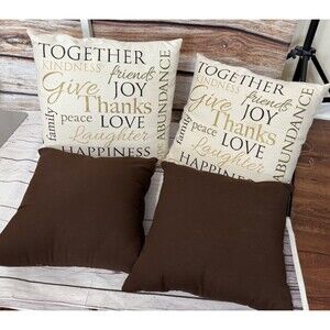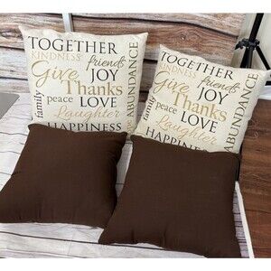 Fall Decorative Throw Pillow Lot 2 Print And 2 Brown Thanksgiving. Larger pillows have a couple of light stains as shown. Not very noticeable and may wash off. Otherwise good. I ship on the same or next day from a smoke-free home. I make every effort to describe items honestly and price them fairly. Feel free to make an offer or ask any questions. Im happy to help. (SW)