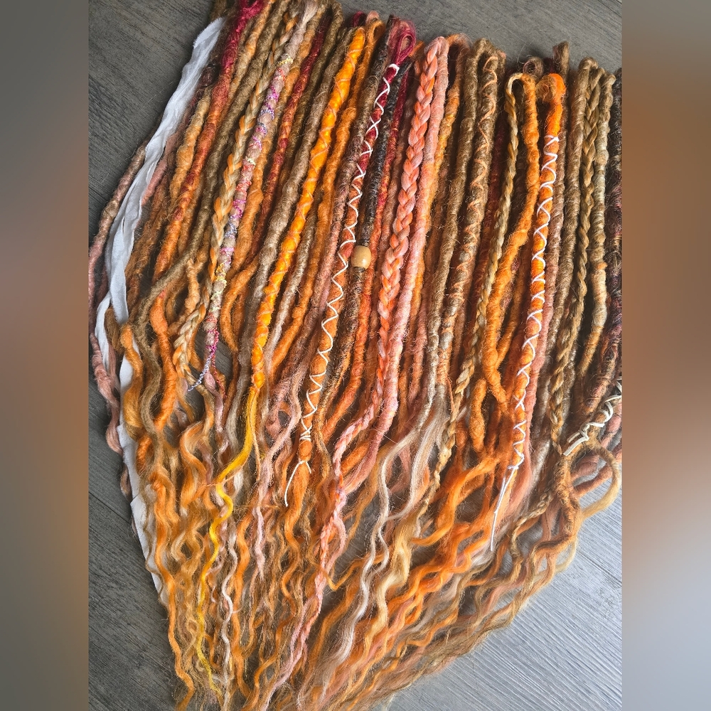 Mix of dark blondes, light blonde, different shades of orange, peachy orange. Some pieces have a burnt red at roots, some pieces have bits of medium brown mixed in.