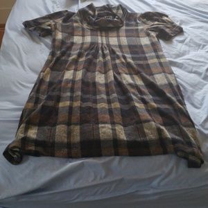 Plaid dress, fleece or sweater like material. Empire waste that gathers a bit under the chest. It is lined and can be paired with tights or leggings or solo. Very cute with booties.