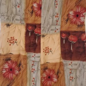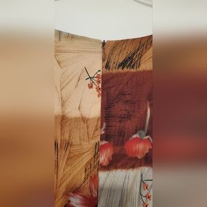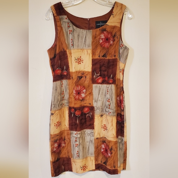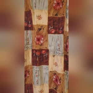 Beautiful patch-like dress! Lots of fall colors with browns and neutrals. Flowers throughout in the squares.