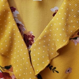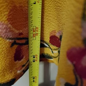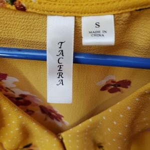 Beautiful ruffled v-neck fall dress made by Tacera. Size small with puffy sleeves. Snap button located in the v-line. Light and flowy with accented built in bow on left side. Mid section and bust area is made of stretchy material. Size is small, could possibly fit a medium due to stretch.