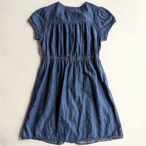 Cute Oshkosh BGosh lightweight denim buttondown dress with ruffle collar / bodice. Slightly cinched / gathered elastic waist with belt loops. Short sleeve. Knee-length. Dark-medium wash. Perfect for family photos or a comfy & adorable back to school dress for fall!