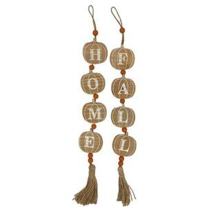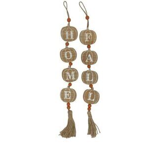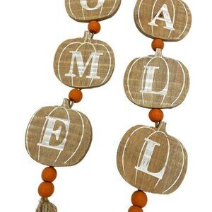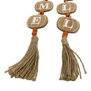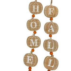 Fall Farmhouse Rustic Natural Wood Pumpkin Bead Garland Tiered Tray Decor. New with tags. One strand spells out home, and the other spells out fall. 21” long, 3” wide.