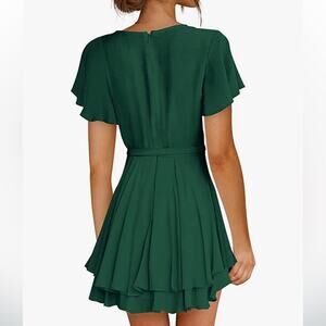 Fall Flowy Green cocktail mini dress with waist tie and ruffle