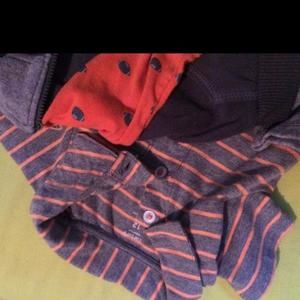 1 orange & gray jersey polo, 1gray with orange accents fleece zipper vest jacket, 1 pair of gray fleece pants, 1 orange long sleeved onsie with footballs on it.