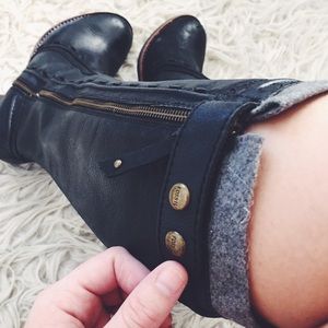 Gorgeous plaid lined black leather Fossil boots. Size 8.5. All defects shown in photos- toes of boots are scratched but not notice lie when wearing. There are marks on the inside underneath of the heels themselves. Also not noticeable. Cute gray wool peeks over the top for extra detail. Varnished gold tone zipper closure. Super comfy. Open to offers but I will just keep them if I can't get what I want for them. Happy shopping! ☺️