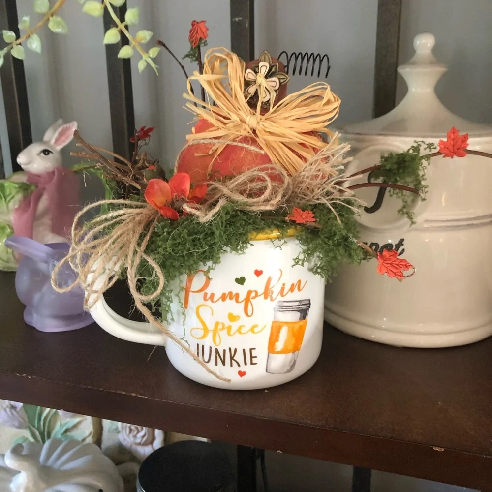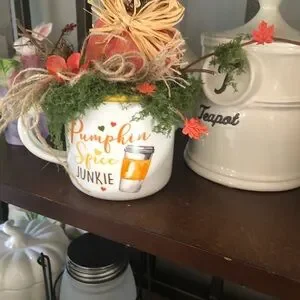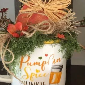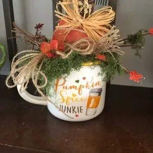 This little sweet fall decor item can fit just about anywhere…mug is filled with all kinds of fall stuff…measures 9 by 9 inches..the wooden pumpkin is crafted..so cute