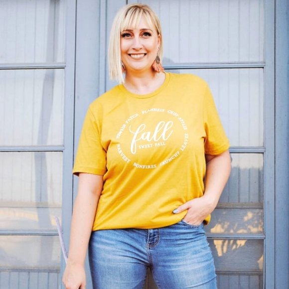 Brand new tees. Flannels, crisp apples, crunchy leaves, bonfires, harvest, and pumpkin patches are all the favorite things about fall highlighted in this heather mustard fall circle graphic tee.