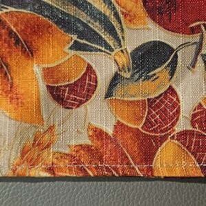 Six beautiful square napkins, each measures 17" x 17" . There are no tags indicating the material, but they feel like polyester. They will compliment any neutral tablecloth. They can also be used for decorating during the fall season. They were used for decorating just once and then put away.