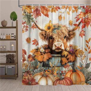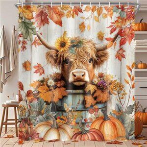 Fall Highland Cow Shower Curtain, Cute Funny Autumn Fall Farmhouse Animal