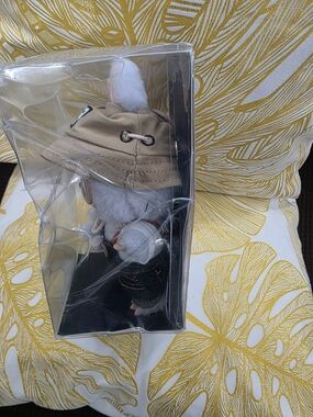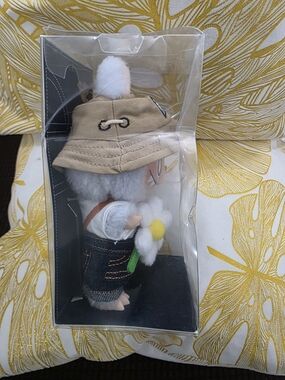 Cute Labubu with soft white fur accents and denim overalls. Features a beige canvas hat and removable plush flower detail. Lightweight and durable for backpacks or bags.