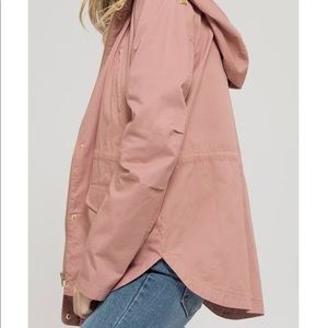 Long sleeve, relaxed fit, snap button jacket with front pockets and hood. Lightweight and perfect for Fall