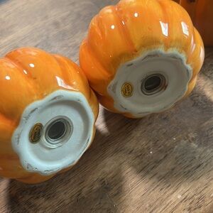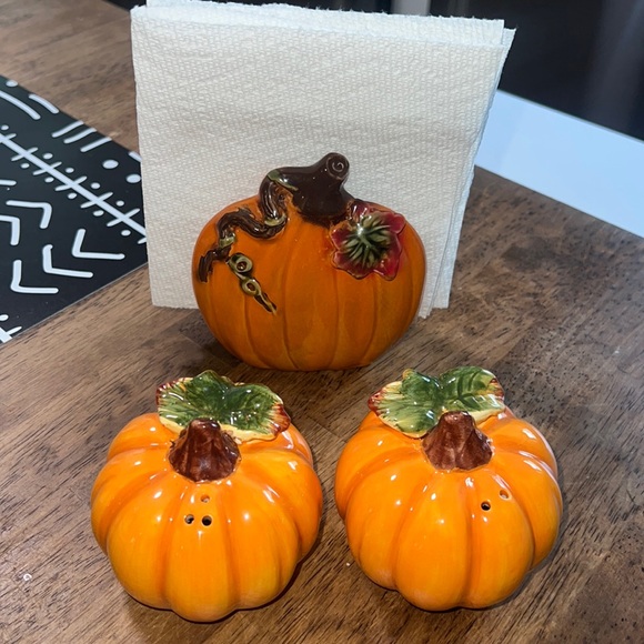 Ceramic Pumpkin salt & pepper shakers & napkin holder. Shakers never used/filled. Used for decor. Perfect fall decor!