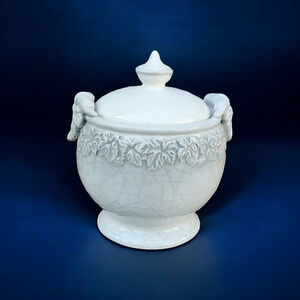 Zoom in and read below for details. Appearance may vary with background, lights, or screen. This lovely vintage versatile glazed porcelain decorative vanity keepsake jar is in good condition. There are no chips or repair. Presents smooth and glossy with an embossed leaf crackle design. Enjoy!