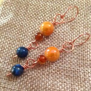 Hand-twisted copper jewelry wire adds an eclectic element, while custom shaped copper earhooks ensure comfort and an artisanal flair. Whether you're sipping cider at the pumpkin patch or dressing up for a crisp evening out, these earrings bring warmth, whimsy, and a touch of boho elegance to any look.