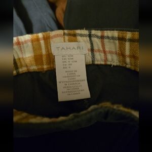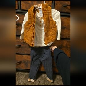 Tahari matching outfit. Long sleeve shirt, vest and pants. Plaid orange, white and navy blue