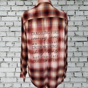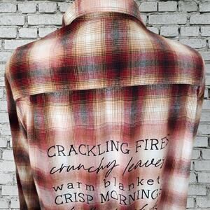 Super Soft Fall Mood List Custom Brand New, Re-Worked Distressed Flannel Shirt, Size XL "Crackling Fires, Crunchy Leaves, Warm Blankets, Crisp Mornings, Chilly Nights, Hot Chocolate, Cozy Sweaters"