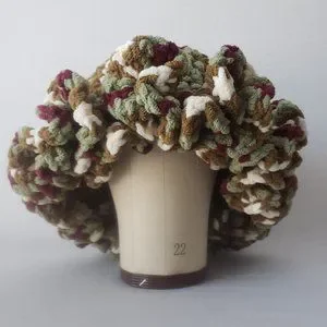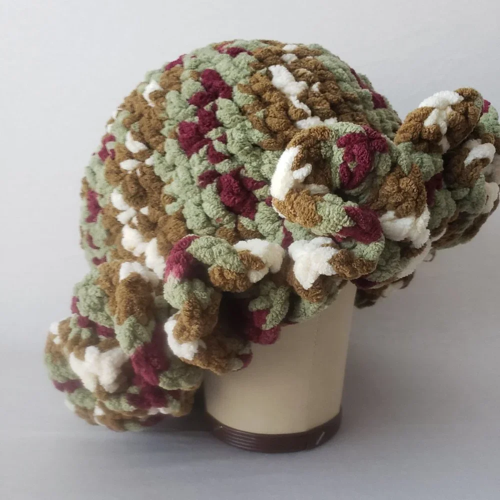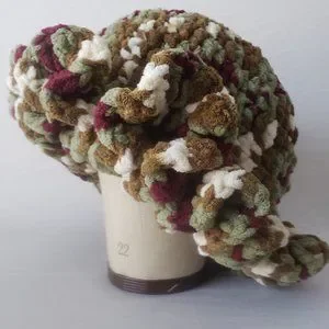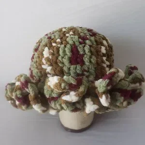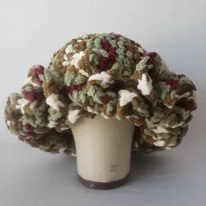 Handmade crochet chunky yarn ruffle hat w/ adjustable ruffles. Made to fit: Adult/Teen Crown - One Size. This hat contains hints of green, cranberry, ivory, and olive hues. Perfect accessory for costumes, cosplay, and parties. This product can be a little warm on your crown when used outdoors, so it may need to be removed a few times for reasonable circulation.