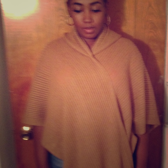 Cute poncho. You can change up the look by opening or wrapping it. Its a tan color. It has a hoodie on it. & also has fringes on the bottom.