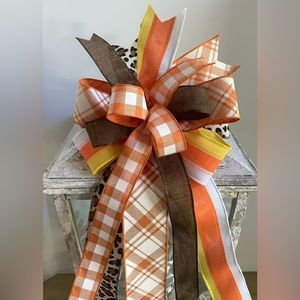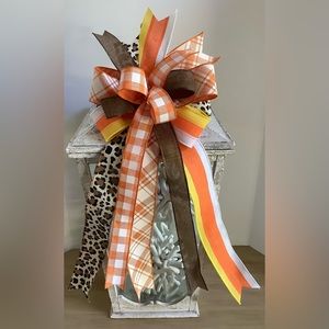 Mix Of Orange, Brown, Yellow, White, & Leopard Ribbons. This Bow Is In Stock Ready To Ship. Wired Ribbons. I Have Attached Floral Wire Ready For You To Attach For Easy Hanging. This Listing Is For The Bow Only. Lantern Is Not Included. Great For Fall!! It Weighs 4 Ounces. I Have More Bows To View Under My Listings. Thanks For Checking Out My Shop!