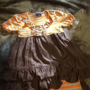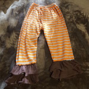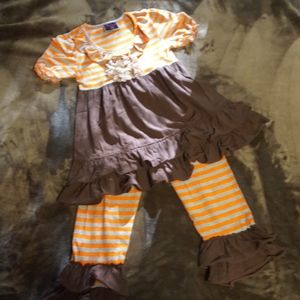 Adorable ruffle outfit in gorgeous fall colors. Beautiful lace flower at center of top. Bought from a boutique. I think it's about a 2T? Top tag says 100 and bottoms tag says 120. Maybe worn once, no real signs of wear. Pants have elastic waist and are roomy enough for cloth diapers or training pants.