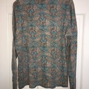 Blue top with a tan pattern. Homemade top that doesn’t have a size.