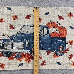 Set of two tapestry style fall season place mats to decorate your table top or buffet with orange and white pumpkins in the back of a vintage blue truck, with fall leaves all around. These place mats measure approximately 12.5 by 18 inches; both are in good preowned condition with a few minor spots as shown in photos.