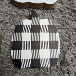 Set of 4 wooden pumpkins. Orange and white "Hello Pumpkin", green and white "Hello Fall", white and gray "Thankful" and black and white buffalo check plaid. The 3 word pumpkins are about 5.5"x4.5" in size, and the buffalo check pumpkin is about 4"x5". They're all about 1 inch thick so they can stand up on a flat surface. 1 pumpkin has the tag sticker removed and 3 still have the tag stickers. All 4 pieces were never used. Excellent condition!