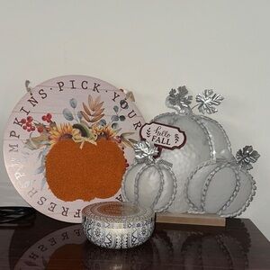 Charming fall decor set featuring pumpkins and autumn accents. Perfect for seasonal decoration. With a scent vanilla cashmere candle.