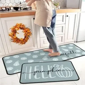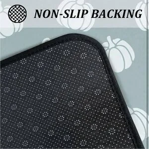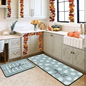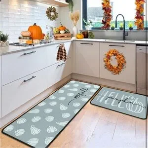 Stylish fall mat set with pumpkin design. Perfect for adding a seasonal touch to your kitchen decor. Mats are made of soft microfiber, super absorbent, non slip and easy to clean. Large mat measures 17"x47". Smaller mat measures 17"x30".