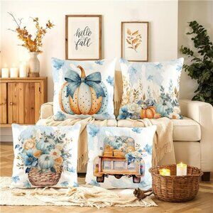 Fall Pumpkin Pillow Covers Set of 4 Velvet 18x18 Blue Orange Decorative Cushions