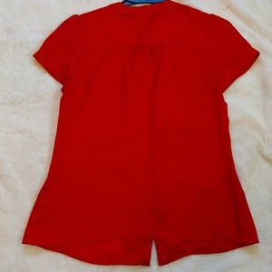 Burt orange silky material. Ruffled collar neckline. Decorative buttons in matching composite material and gold rim. Cap short sleeves. Offers welcome