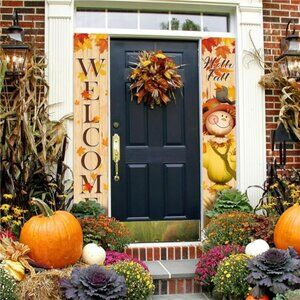 read The Joy Of The Harvest: The fall Thanksgiving banner features a fun scarecrow print and [Welcome]; our fall porch decor is perfect for decorating for fall gatherings and will be the highlight of all your decor!