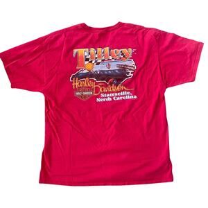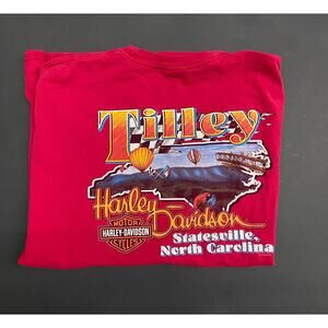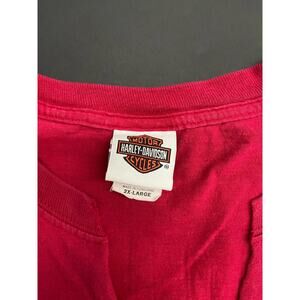 Vintage 90s Harley Davidson oversized T-shirt in a vibrant red color. This unique V-neck tee features a bold motorcycle design, perfect for any Harley enthusiast.
