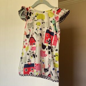 This is a cute farm print top with flutter sleeves and a bow. It is a size 3 and would be great for a hoedown or school party.
