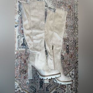 Jennifer Lopez knee-high boots - beige boots - fall fashion - size 8 - block heel boots - round toe boots - trendy fall shoes - cream boots - neutral boots- fall boots - over the knee boots - winter boots - fashion booties